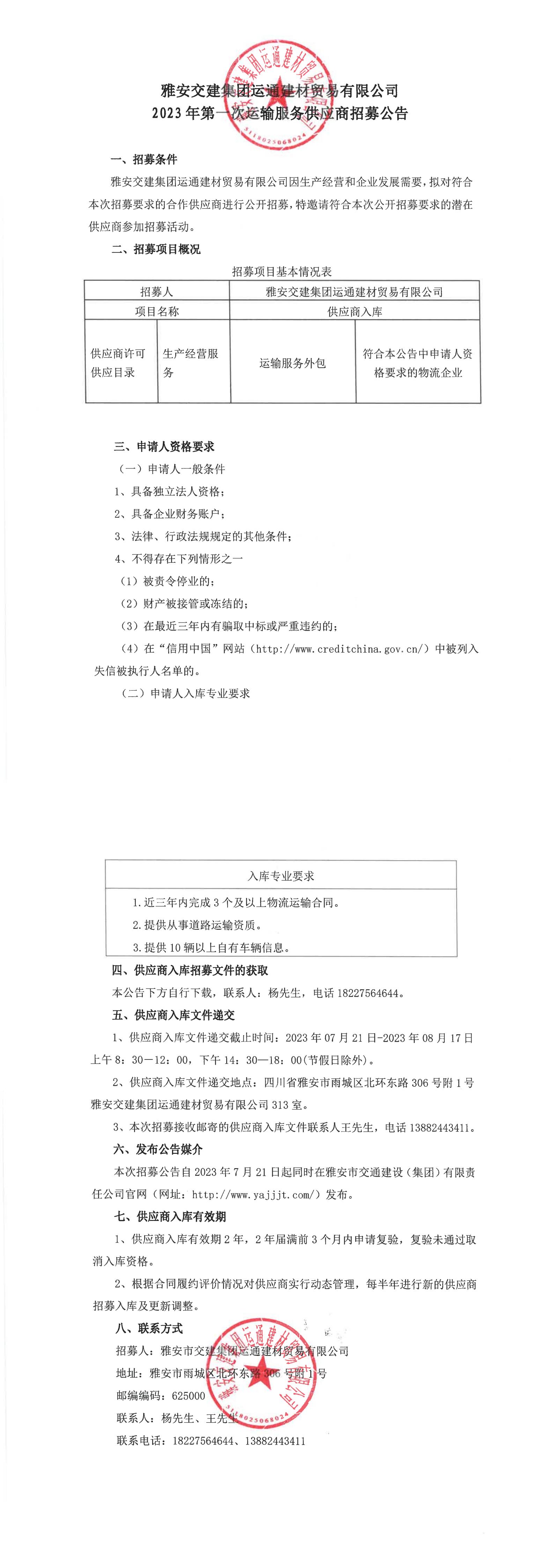 雅安交建集團運通建材貿(mào)易有限公司2023年第一次運輸服務供應商招募公告