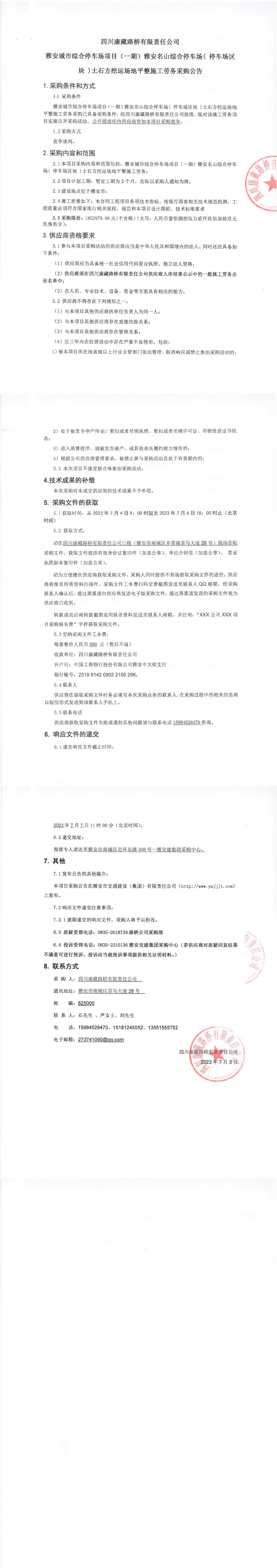 四川康藏路橋有限責(zé)任公司雅安城市綜合停車場項(xiàng)目(一期)雅安名山綜合停車場(停車場區(qū)塊)土石方挖運(yùn)場地平整施工勞務(wù)采購公告