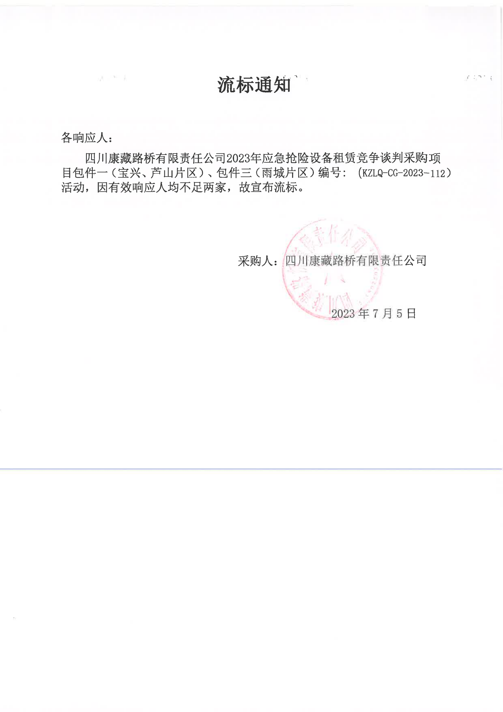 四川康藏路橋有限責任公司2023年應急搶險設(shè)備租賃競爭談判采購項目包件一(寶興、蘆山片區(qū))、包件三(雨城片區(qū))流標通知