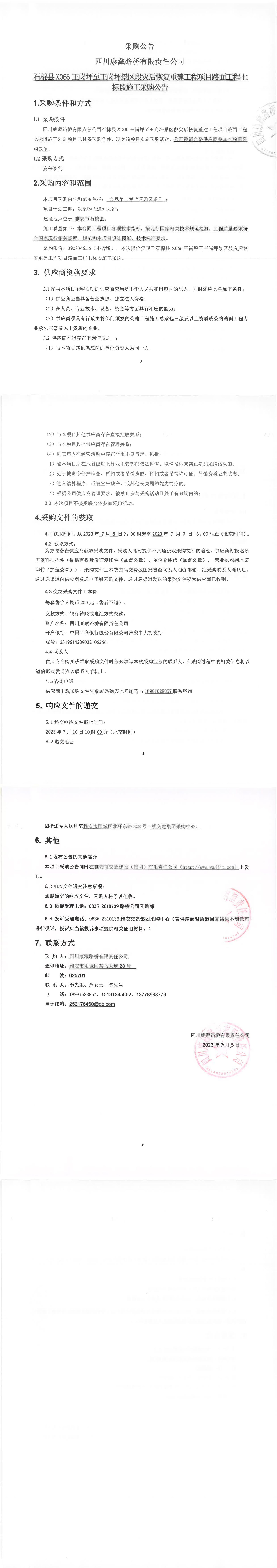 四川康藏路橋有限責任公司石棉縣X66X王崗坪景區(qū)段災后恢復重建工程項目路面工程七標段施工采購公告
