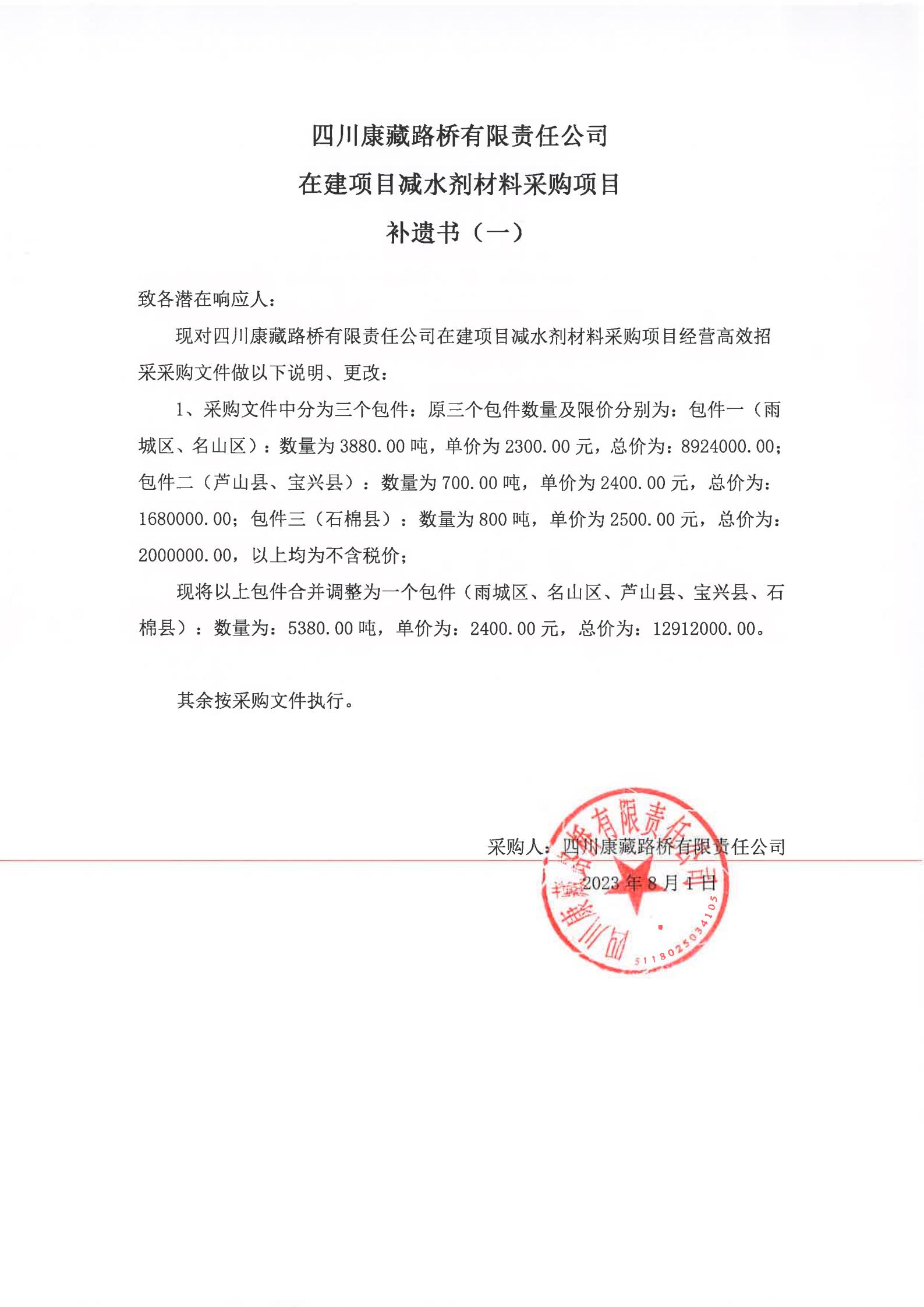 四川康藏路橋有限責任公司在建項目減水劑材料采購項目補遺書(一)