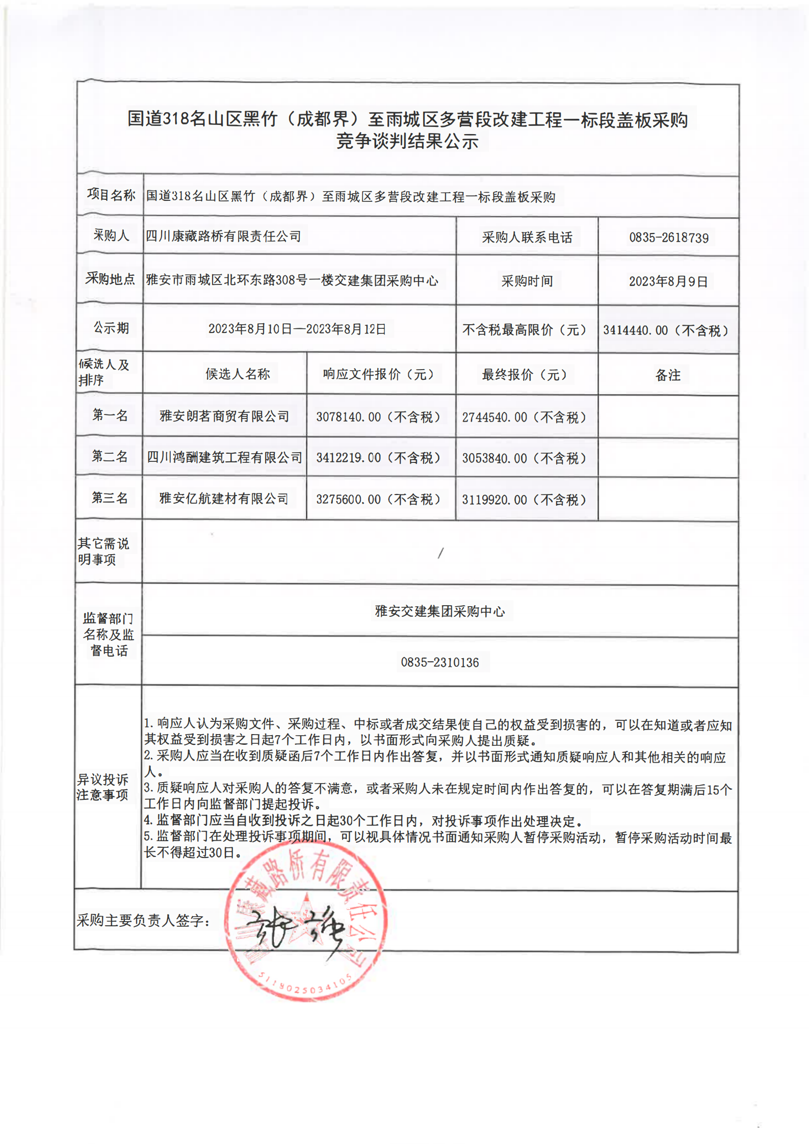 四川康藏路橋有限責任公司國道318名山區(qū)黑竹(成都界)至雨城區(qū)多營段改建工程一標段蓋板采購競爭談判結(jié)果公示