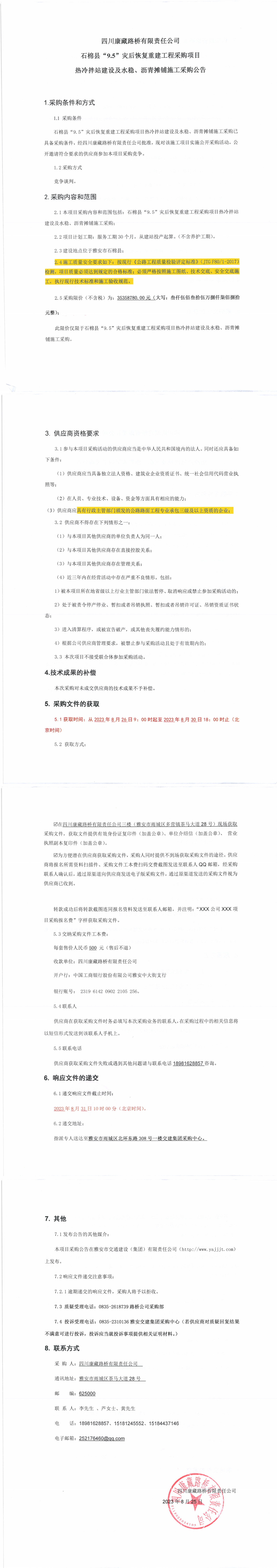 四川康藏路橋有限責(zé)任公司石棉縣“9.5”災(zāi)后恢復(fù)重建工程采購(gòu)項(xiàng)目熱冷拌站建設(shè)及水穩(wěn)、瀝青攤鋪施工采購(gòu)公告