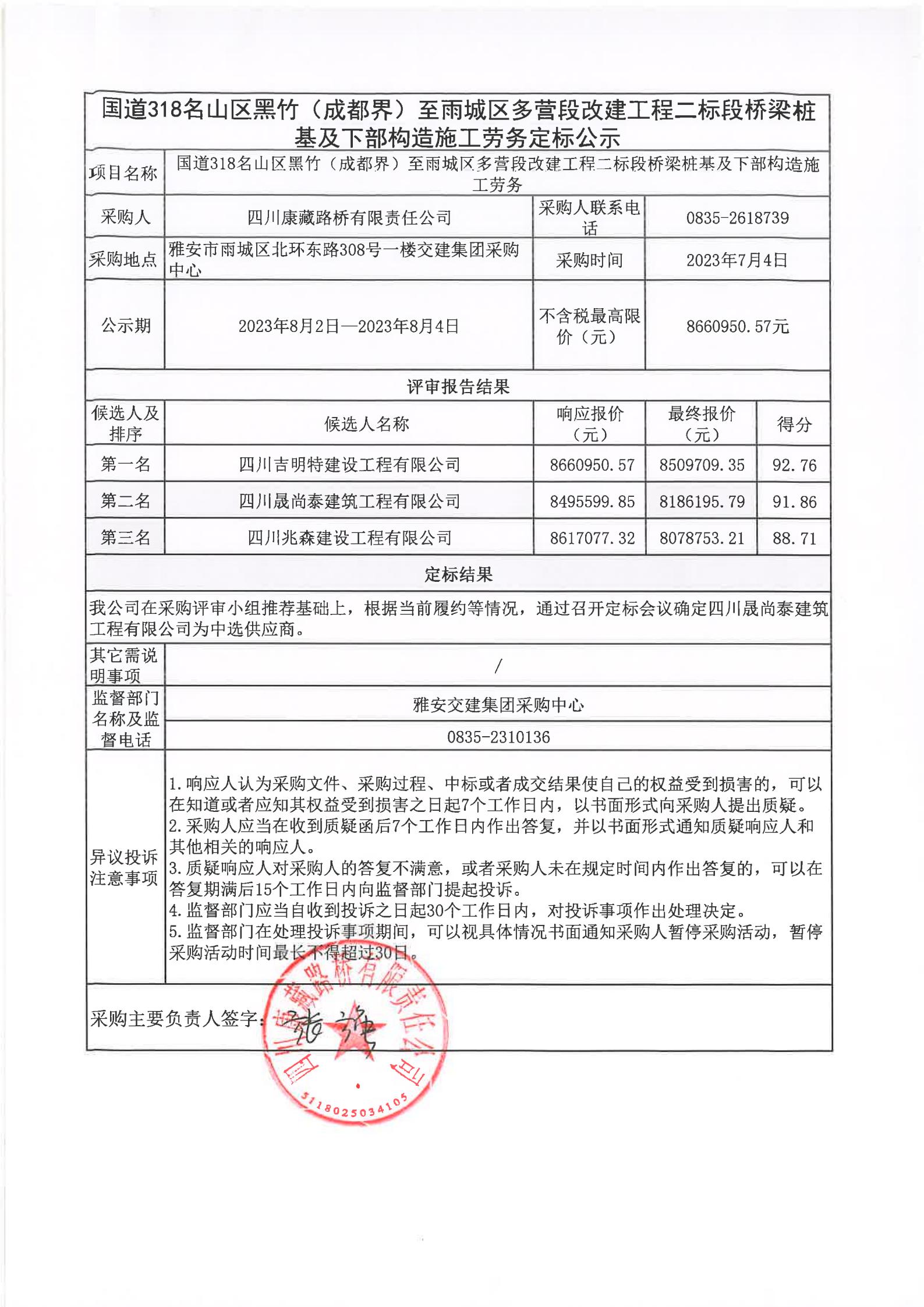 四川康藏路橋有限責(zé)任公司國(guó)道318名山區(qū)黑竹(成都界)至雨城區(qū)多營(yíng)段改建工程二標(biāo)段橋梁樁基及下部構(gòu)造施工勞務(wù)定標(biāo)公示