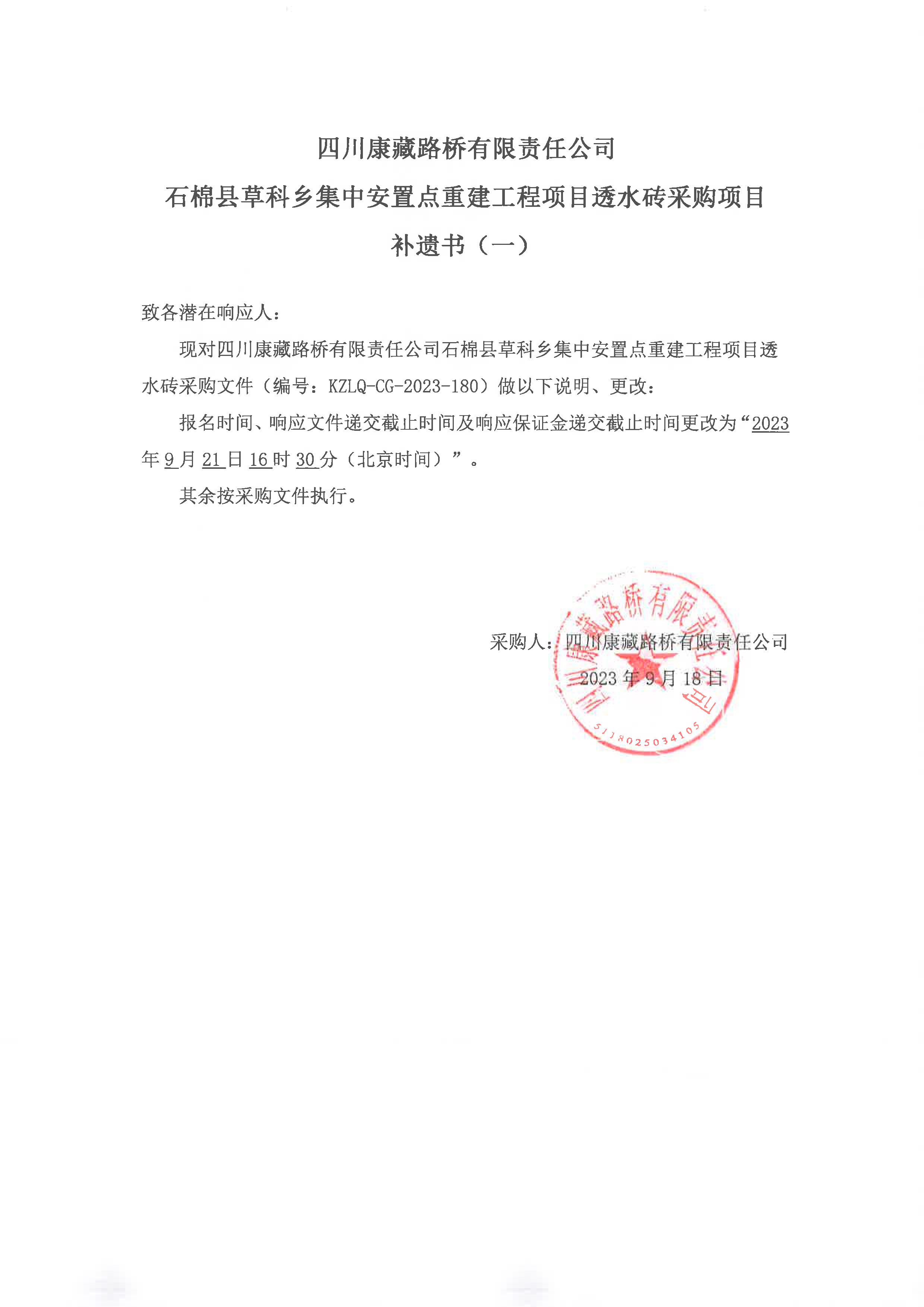 四川康藏路橋有限責(zé)任公司石棉縣草科鄉(xiāng)集中安置點重建工程項目透水磚采購項目補(bǔ)遺書(一)