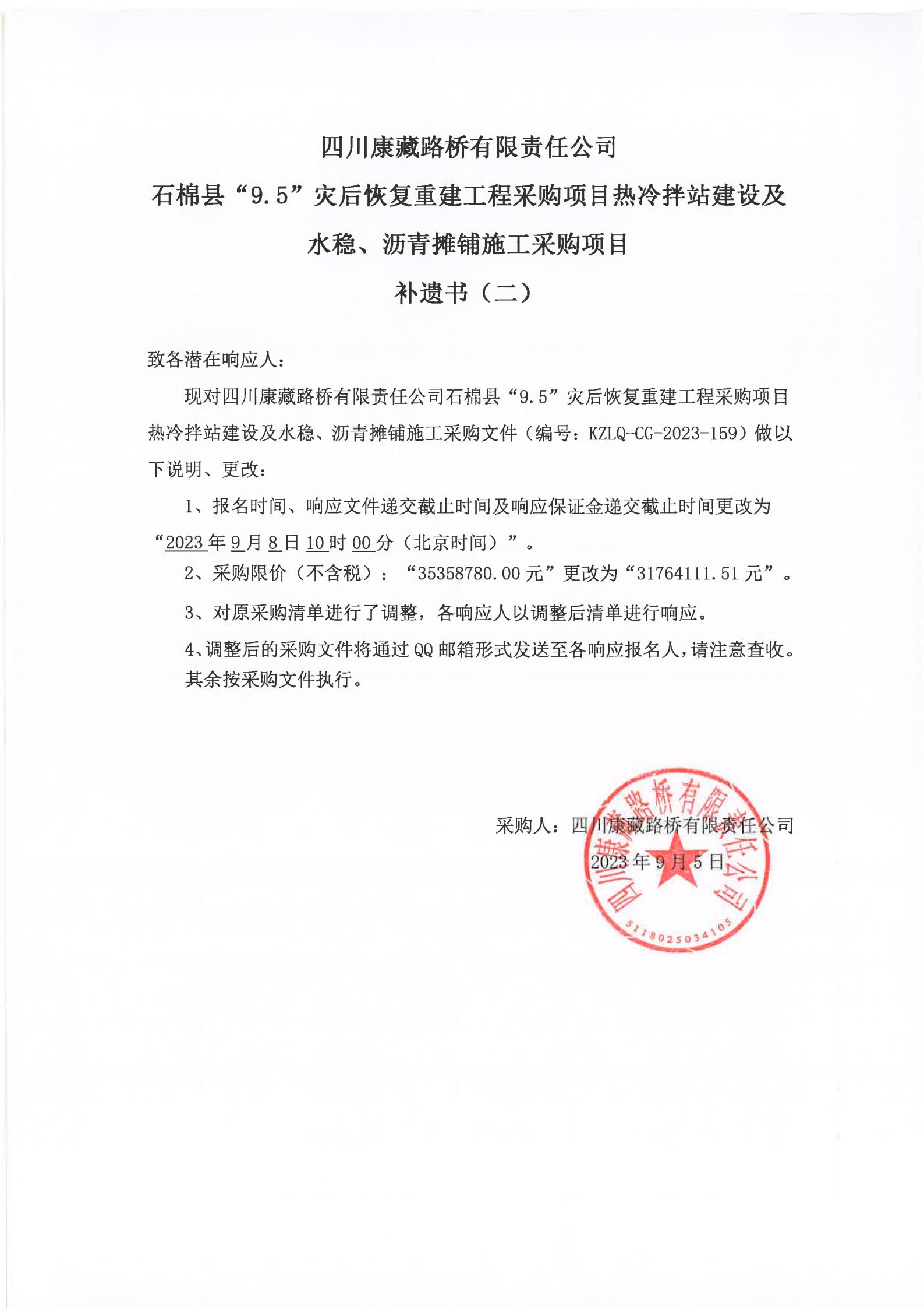 四川康藏路橋有限責(zé)任公司石棉縣“9·5”災(zāi)后恢復(fù)重建工程采購項目熱冷拌站建設(shè)及水穩(wěn)、瀝青攤鋪施工采購項目補遺書(二)