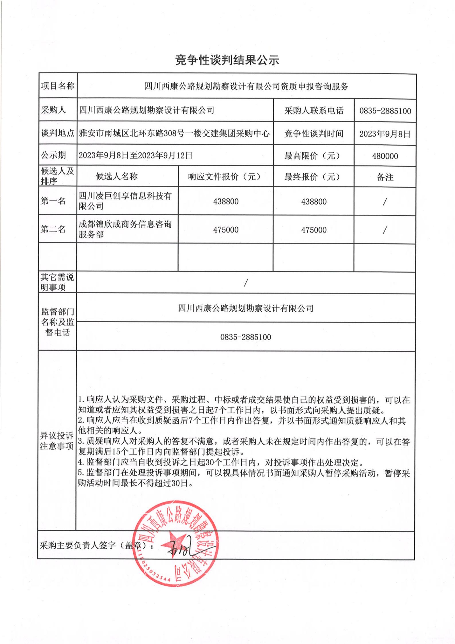 四川西康公路規(guī)劃勘察設(shè)計有限公司資質(zhì)申報咨詢服務(wù)競爭談判結(jié)果公示
