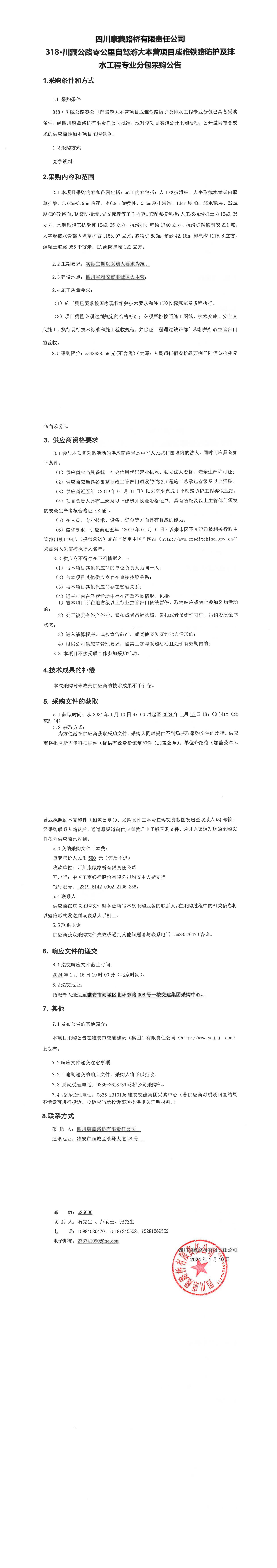 四川康藏路橋有限責(zé)任公司318·川藏公路零公里自駕游大本營(yíng)項(xiàng)目成雅鐵路防護(hù)及排水工程專(zhuān)業(yè)分包采購(gòu)公告