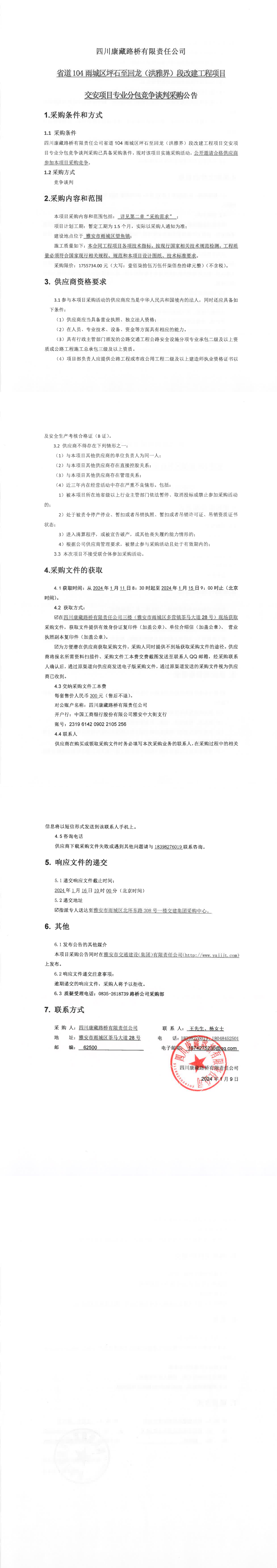 四川康藏路橋有限責(zé)任公司省道104雨城區(qū)坪石至回龍(洪雅界)段改建工程項(xiàng)目交安項(xiàng)目專業(yè)分包競爭談判采購公告