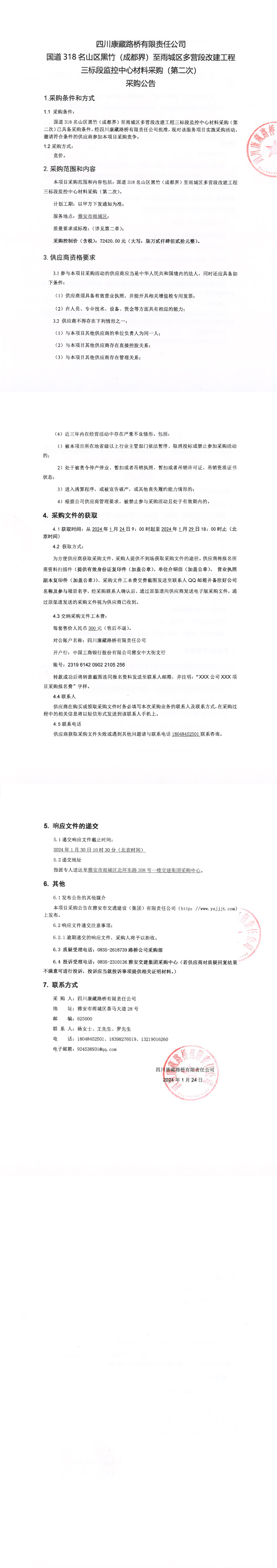 四川康藏路橋有限責(zé)任公司國道318名山區(qū)黑竹(成都界)至雨城區(qū)多營段改建工程三標(biāo)段監(jiān)控中心材料采購(第二次)采購公告
