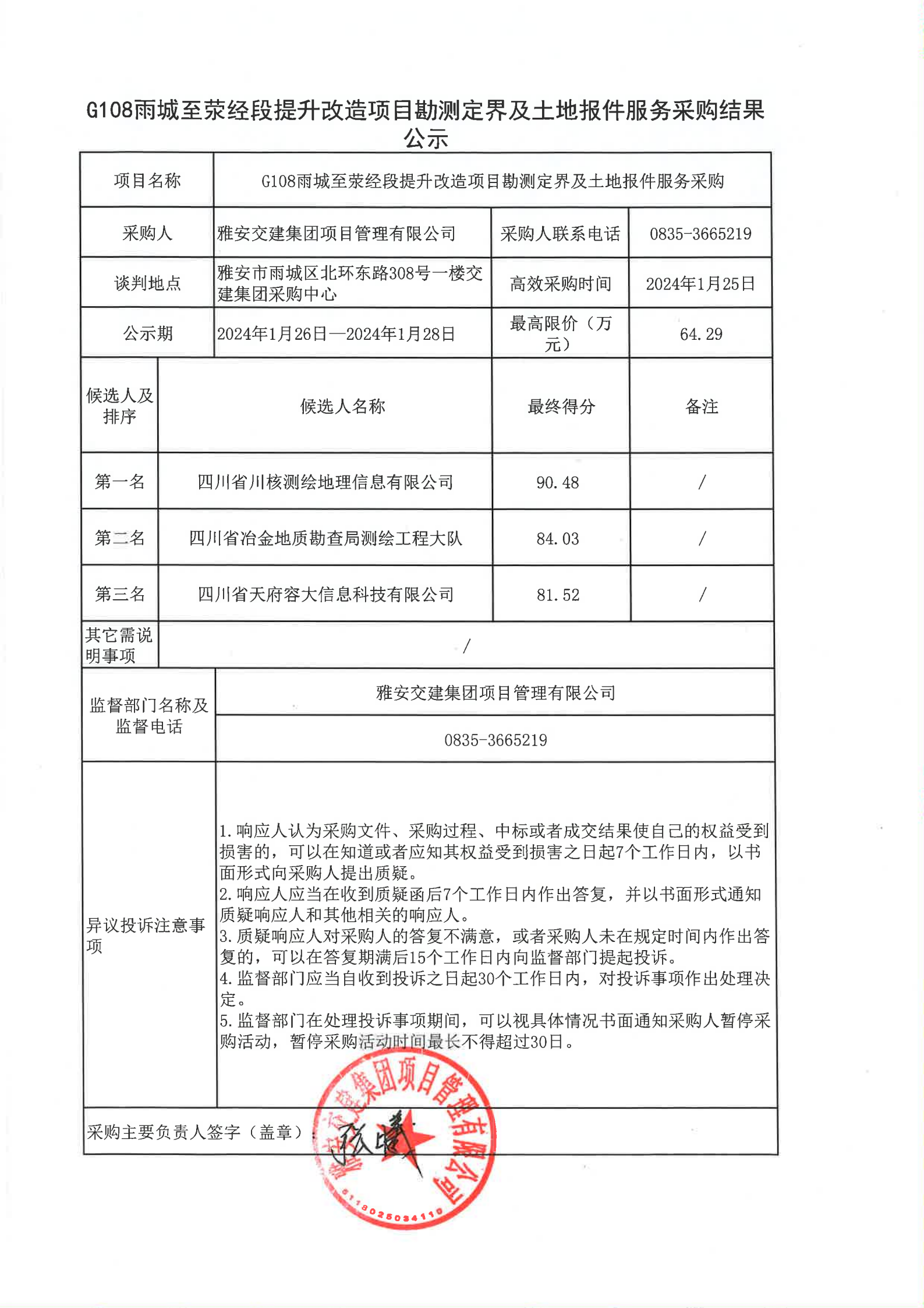 四川康藏路橋有限責(zé)任公司G108雨城至滎經(jīng)段提升改造項(xiàng)目勘測(cè)定界及土地報(bào)件服務(wù)采購(gòu)結(jié)果公示