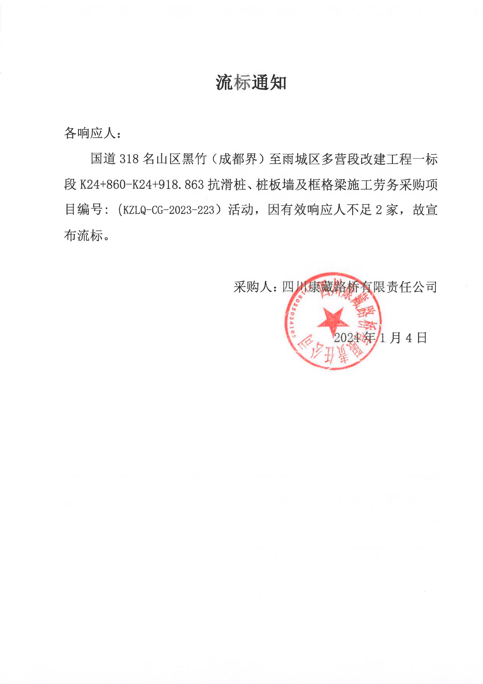 四川康藏路橋有限責(zé)任公司國道318名山區(qū)黑竹(成都界)至雨城區(qū)多營段改建工程一標(biāo)段K24+860-K24+918.863抗滑樁、樁板墻及框格梁施工勞務(wù)采購項(xiàng)目流標(biāo)通知