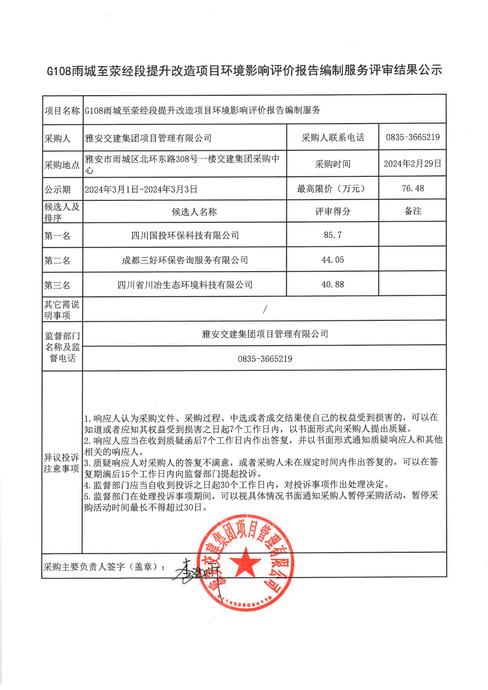 雅安交建集團(tuán)項目管理有限公司G108雨城至滎經(jīng)段提升改造項目環(huán)境影響評價報告編制服務(wù)評審結(jié)果公示