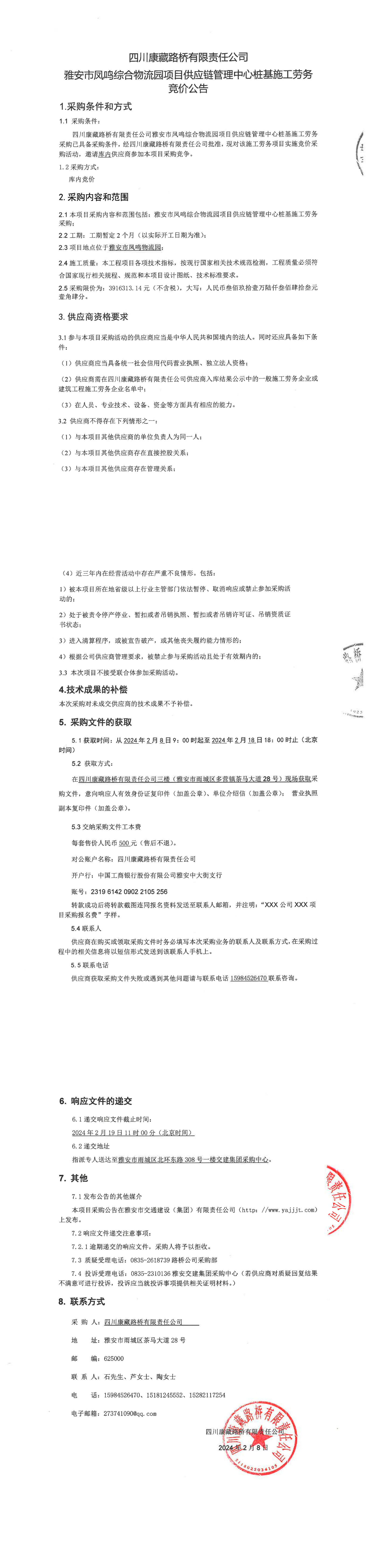 四川康藏路橋有限責(zé)任公司雅安市鳳鳴綜合物流園項(xiàng)目供應(yīng)鏈管理中心樁基施工勞務(wù)采購公告