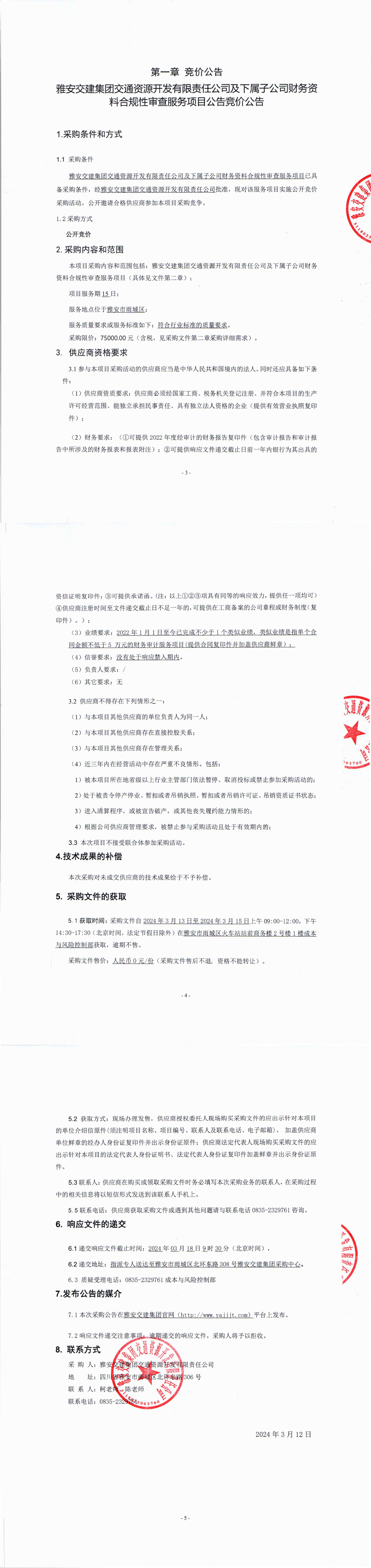 雅安交建集團(tuán)交通資源開發(fā)有限責(zé)任公司及下屬子公司財(cái)務(wù)資料合規(guī)性審查服務(wù)項(xiàng)目公告競(jìng)價(jià)公告