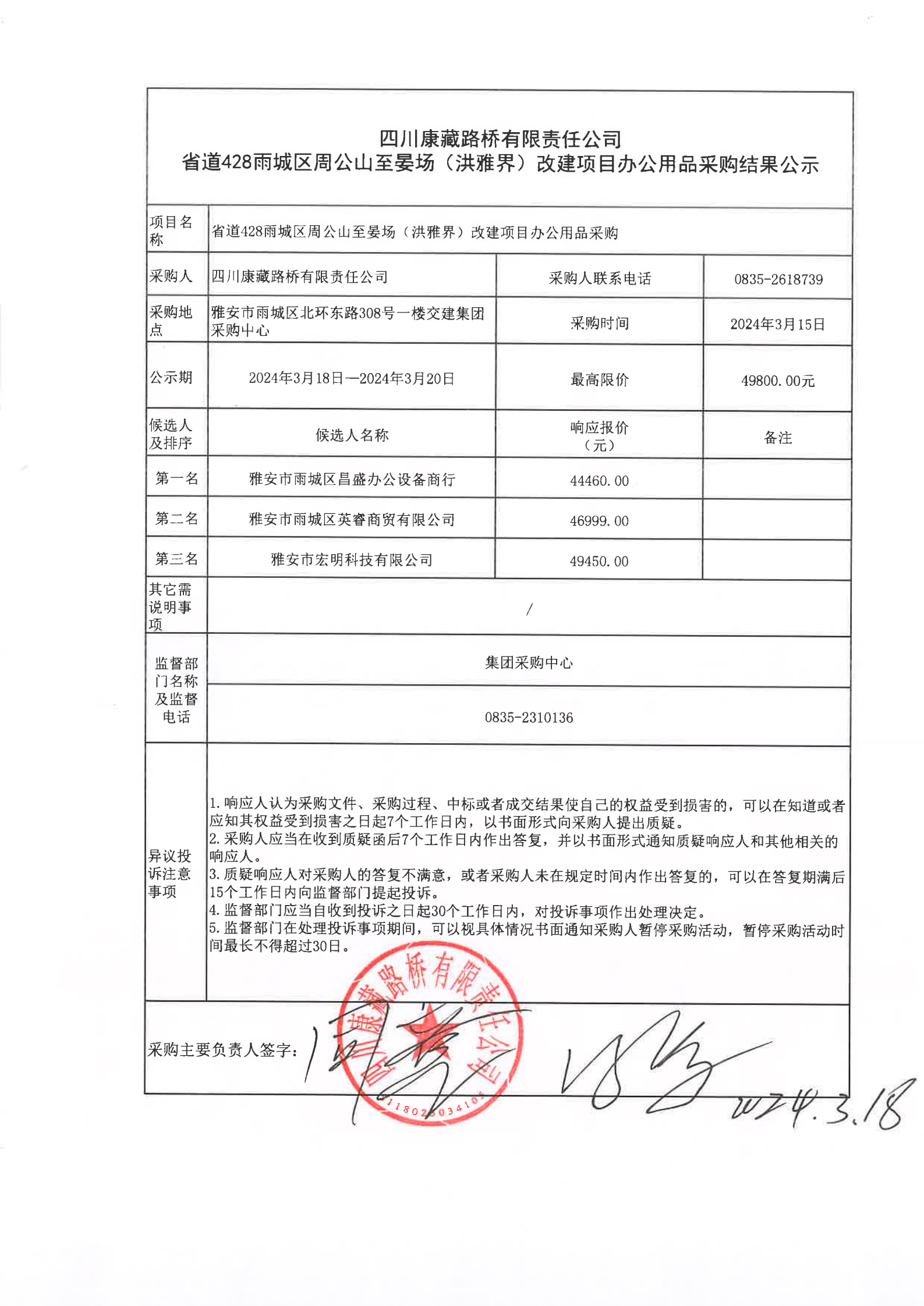 四川康藏路橋有限責(zé)任公司省道428雨城區(qū)周公山至晏場(洪雅界)改建項(xiàng)目辦公用品(第二次)采購結(jié)果公示