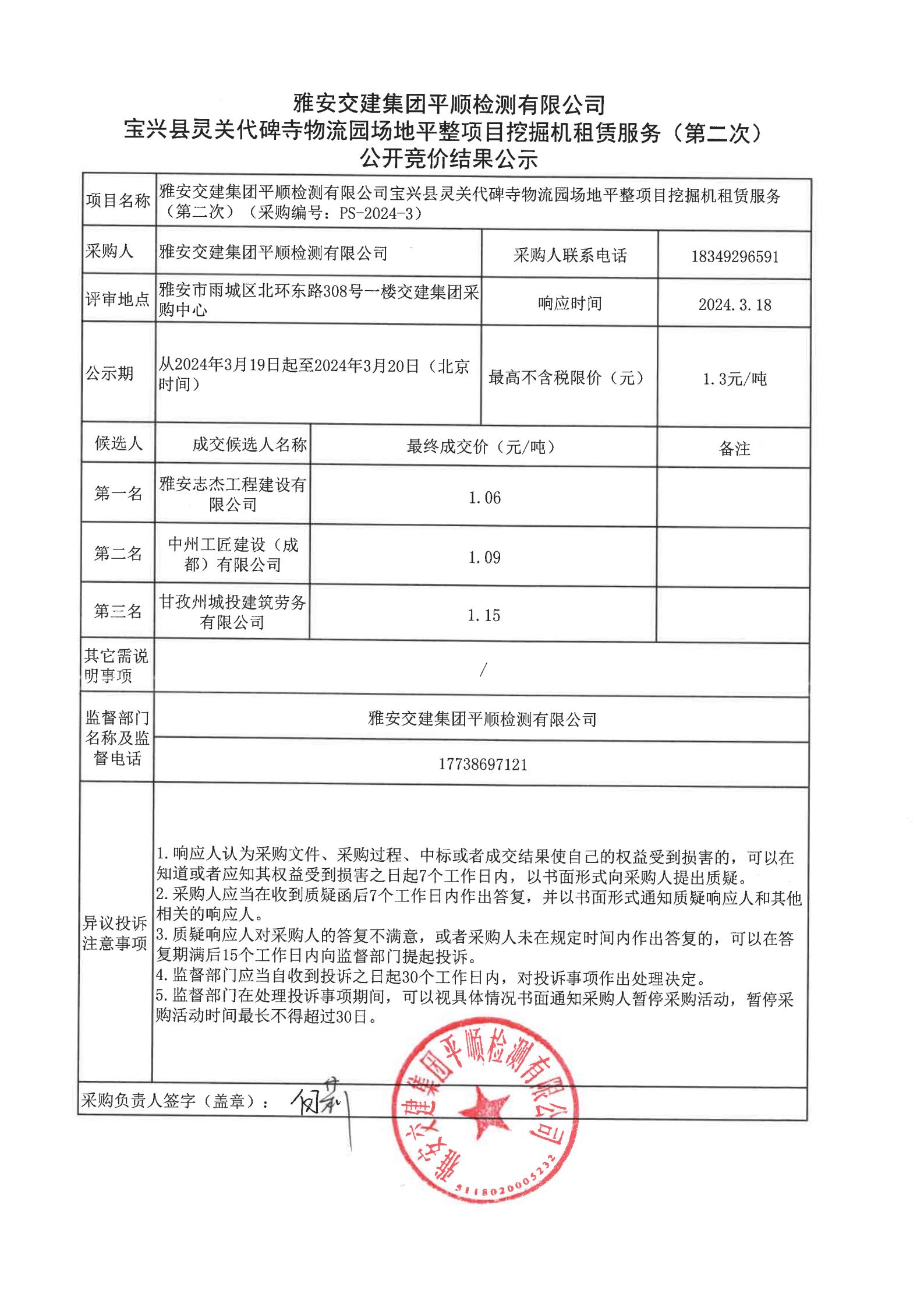 雅安交建集團(tuán)平順檢測(cè)有限公司寶興縣靈關(guān)代碑寺物流園場(chǎng)地平整項(xiàng)目挖掘機(jī)租賃服務(wù)(第二次)競(jìng)價(jià)結(jié)果公示