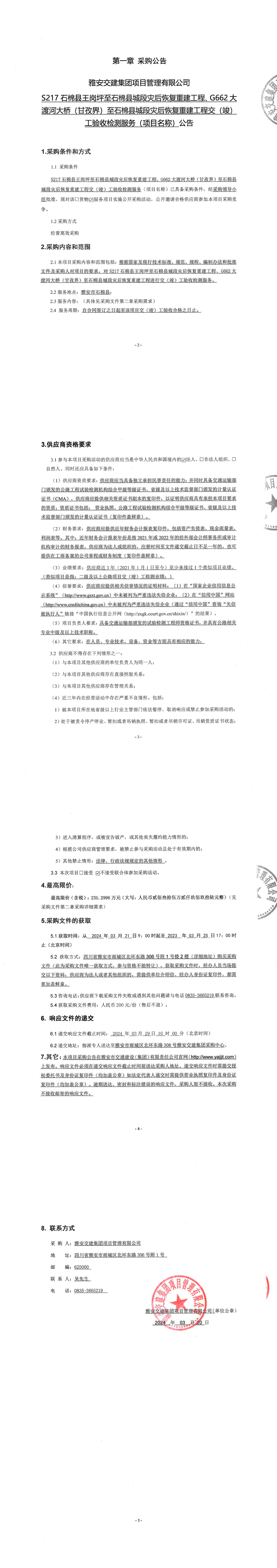 雅安交建集團項目管理有限公司S217石棉縣王崗坪至石棉縣城段災(zāi)后恢復(fù)重建工程、G662大渡河大橋(甘孜界)至石棉縣城段災(zāi)后恢復(fù)重建工程交(竣)工驗收檢測服務(wù)(項目名稱)公告