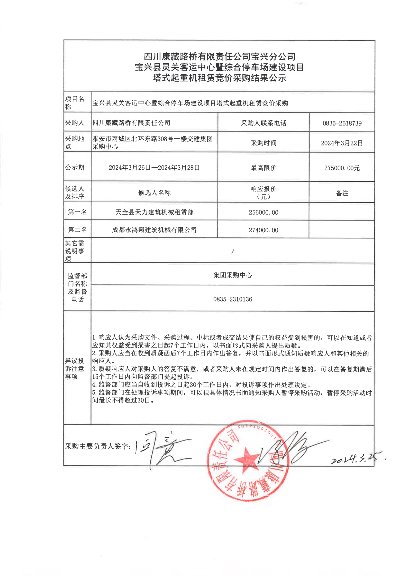四川康藏路橋有限責任公司寶興縣靈關客運中心暨綜合停車場建設項目塔式起重機租賃競價采購結(jié)果公示