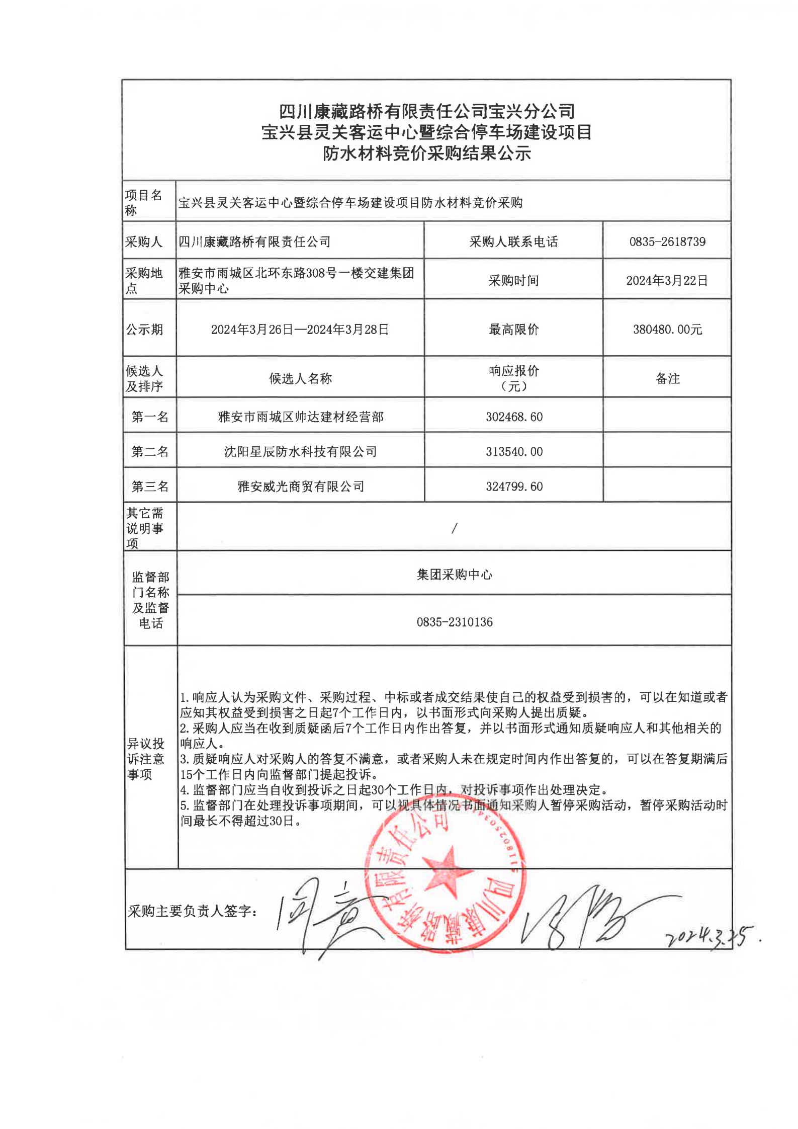 四川康藏路橋有限責任公司寶興縣靈關(guān)客運中心暨綜合停車場建設(shè)項目防水材料競價采購結(jié)果公示
