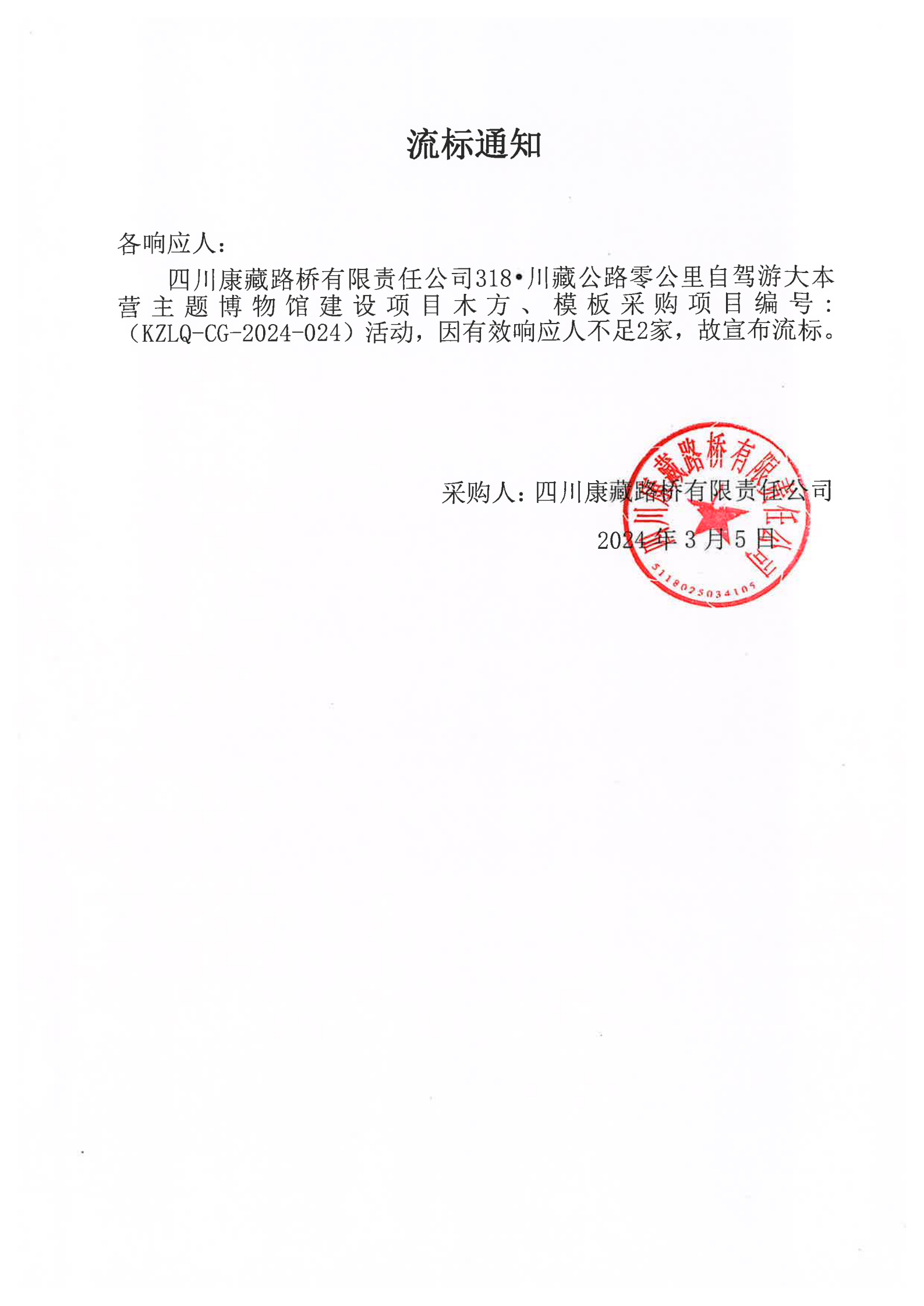 四川康藏路橋有限責任公司318·川藏公路零公里自駕游大本營主題博物館建設項目木方、模板采購流標通知