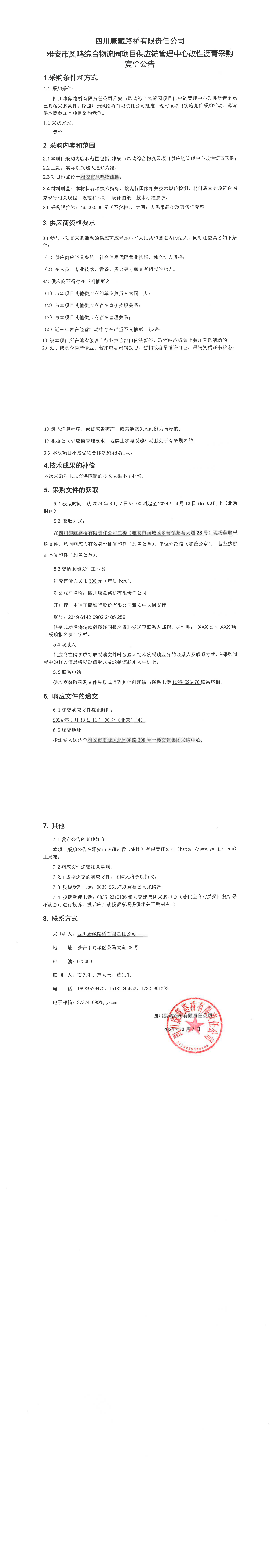 四川康藏路橋有限責任公司雅安市鳳鳴綜合物流園項目供應(yīng)鏈管理中心改性瀝青采購競價公告