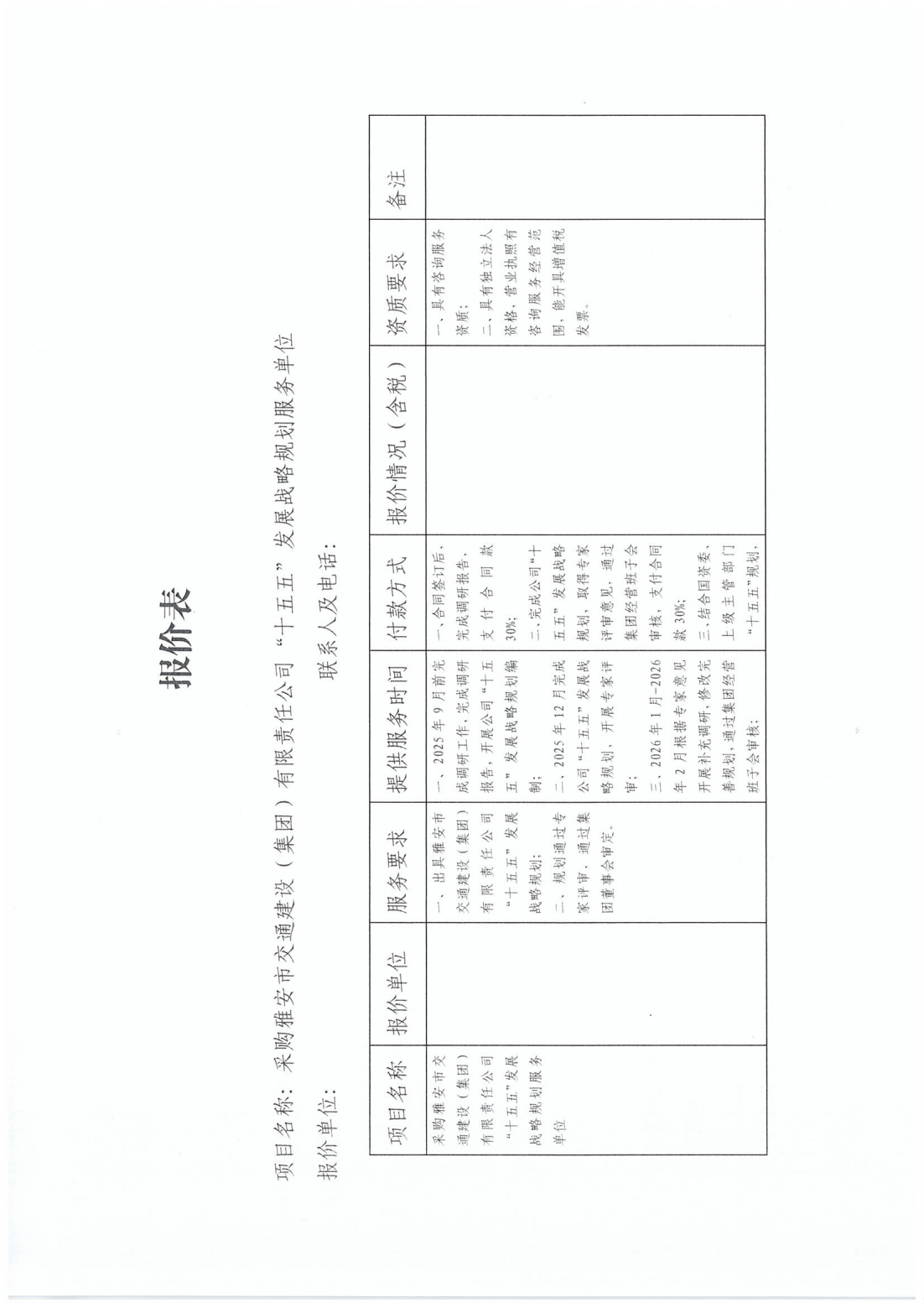 關(guān)于采購(gòu)雅安市交通建設(shè)(集團(tuán))有限責(zé)任公司“十五五”發(fā)展戰(zhàn)略規(guī)劃服務(wù)單位的詢價(jià)