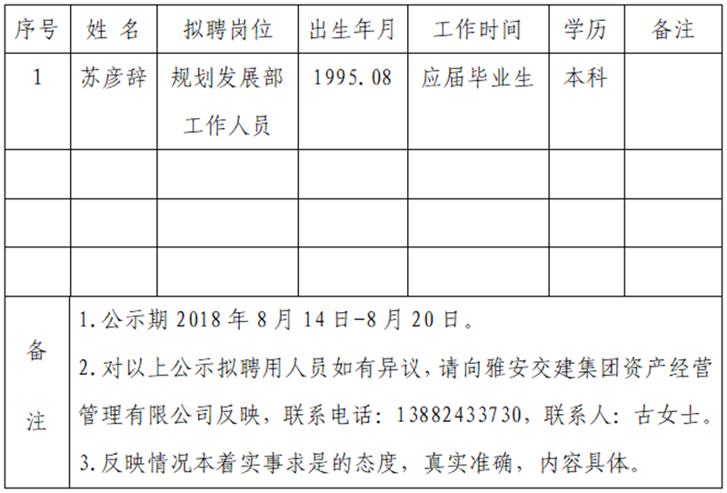 通過公開報名、資格審查、筆試、面試等程序,經雅安交建集團資產經營管理有限公司研究擇優(yōu)確定以下1名擬聘用人員,現公示名單如下: