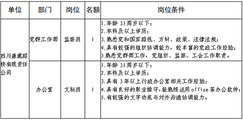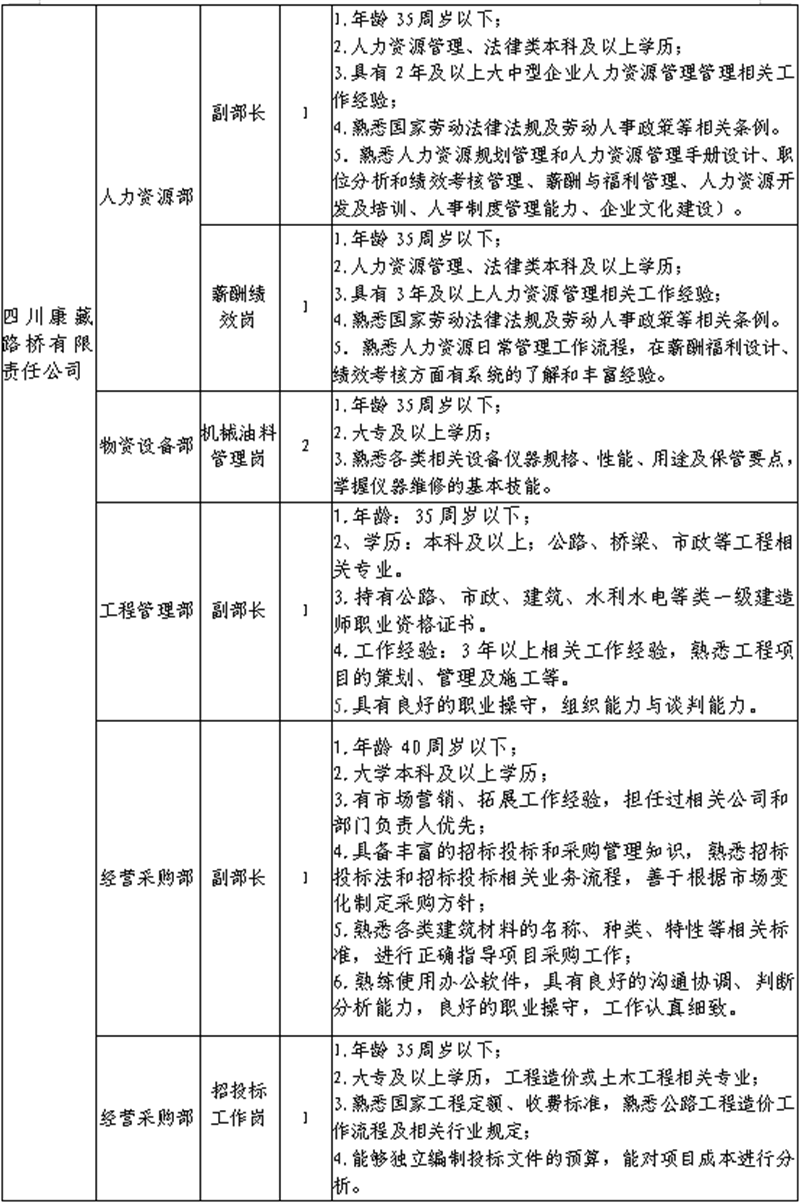 根據(jù)發(fā)展需要,決定面向社會公開招聘雅安市交通建設(集團)有限責任公司(以下簡稱“雅安交建集團”)所屬子公司工作人員16名,現(xiàn)將有關(guān)事項公告如下: