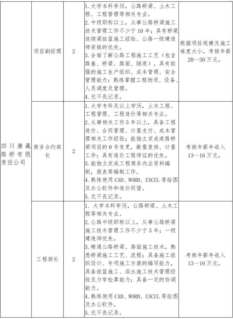 根據(jù)發(fā)展需要,決定面向社會公開招聘雅安市交通建設(shè)(集團(tuán))有限責(zé)任公司(以下簡稱“雅安交建集團(tuán)”)所屬子公司工程項目主要負(fù)責(zé)人10名,現(xiàn)將有關(guān)事項公告如下:
