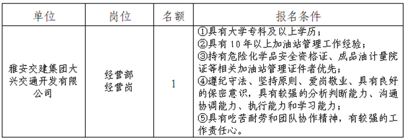 根據(jù)發(fā)展需要,決定面向社會公開招聘雅安市交通建設(shè)(集團(tuán))有限責(zé)任公司(以下簡稱“雅安交建集團(tuán)”)所屬子公司工作人員1名,現(xiàn)將有關(guān)事項公告如下: