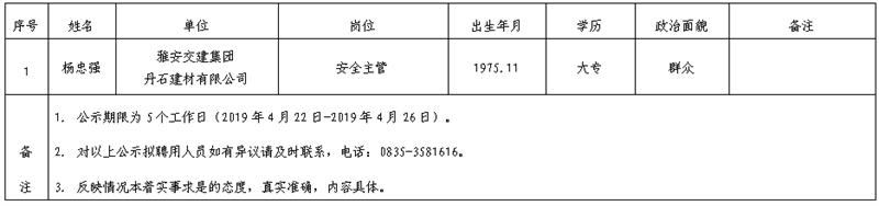 雅安交建集團(tuán)子公司擬聘用人員公示(丹石建材公司)