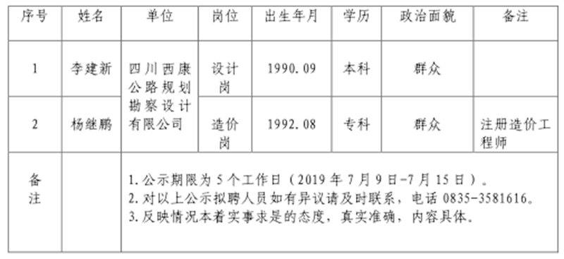 雅安交建集團(tuán)子公司擬聘用人員公示(佳岳公司)