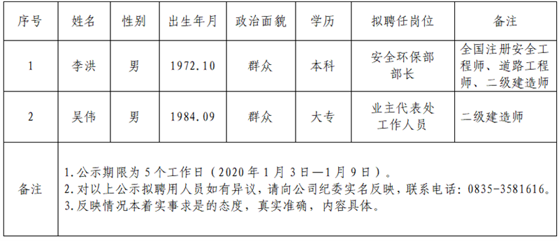 雅安交建集團項目管理有限公司擬聘用人員公示