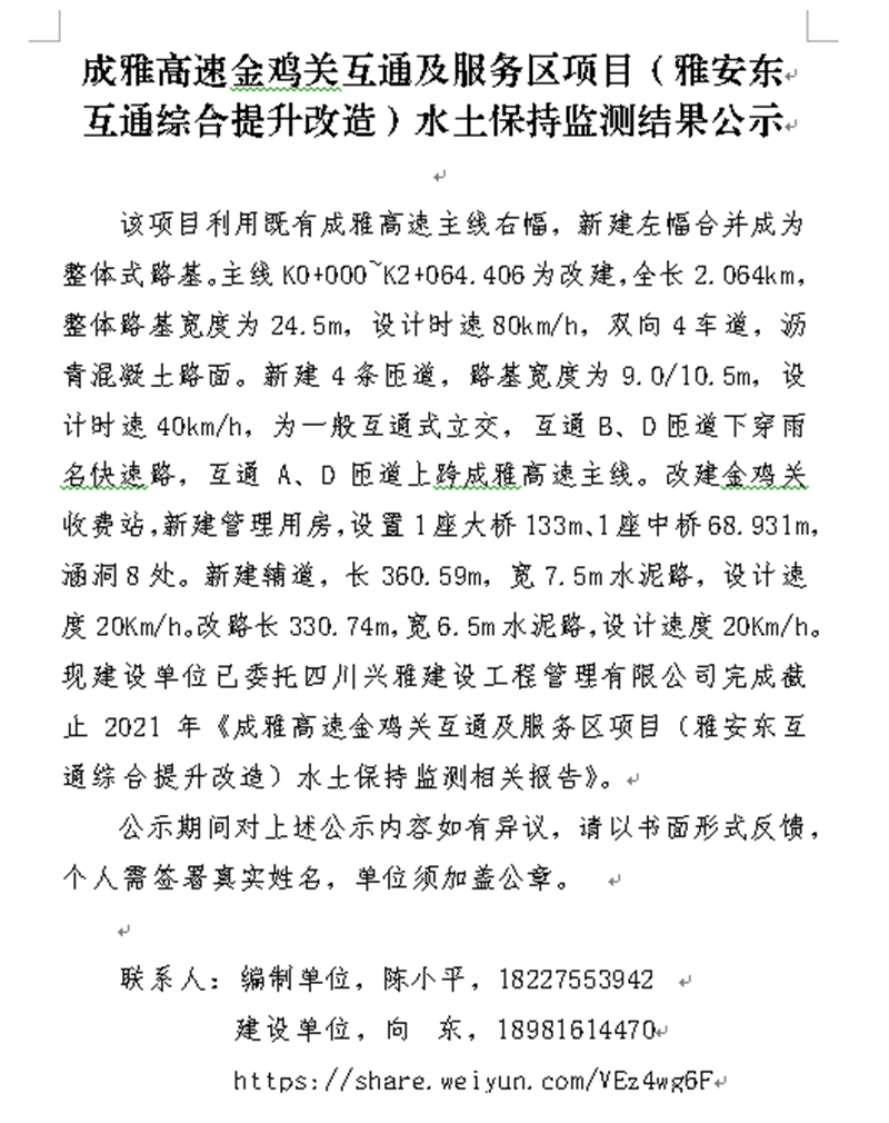 成雅高速金雞關(guān)互通及服務(wù)區(qū)項目(雨名快速通道)水土保持監(jiān)測結(jié)果公示