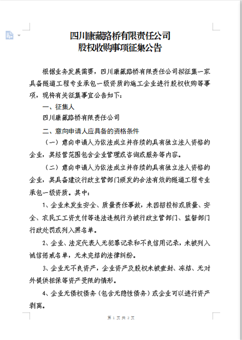 四川康藏路橋有限責任公司 股權收購事項征集公告