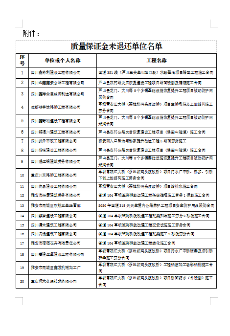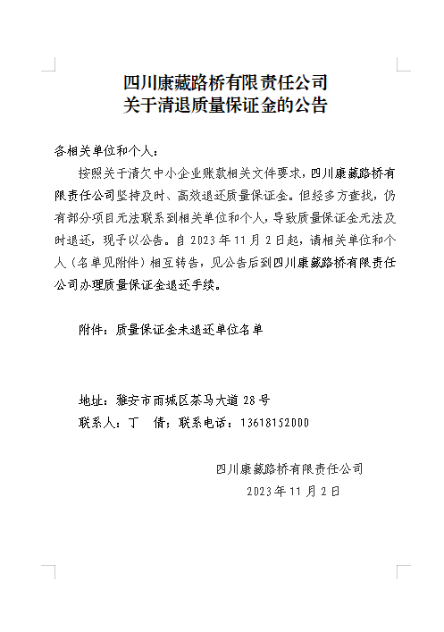 四川康藏路橋有限責任公司關于清退質(zhì)量保證金的公告