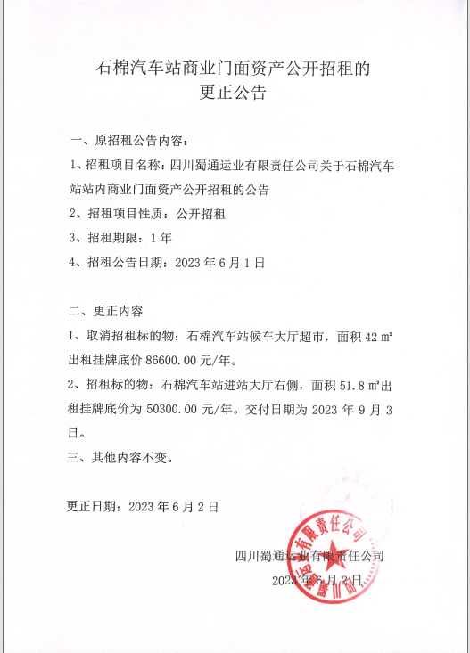 蜀通公司石棉汽車站商業(yè)門面資產(chǎn)公開招租的更正公告