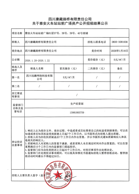 四川康藏路橋有限責任公司關于雅安火車站站前廣場資產(chǎn)公開招租結(jié)果公示