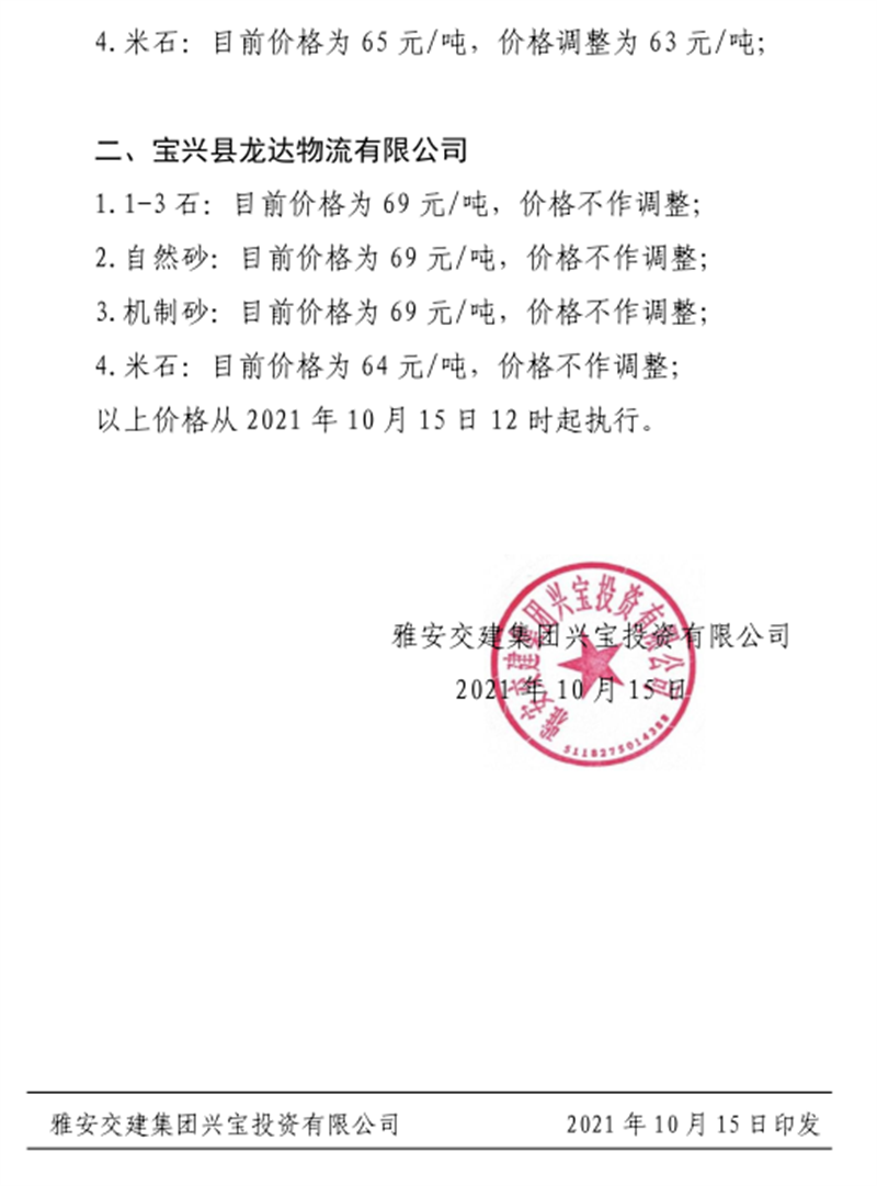 雅安交建集團(tuán)興寶公司關(guān)于調(diào)整成品料銷售價(jià)格的通知(2021.10.15)