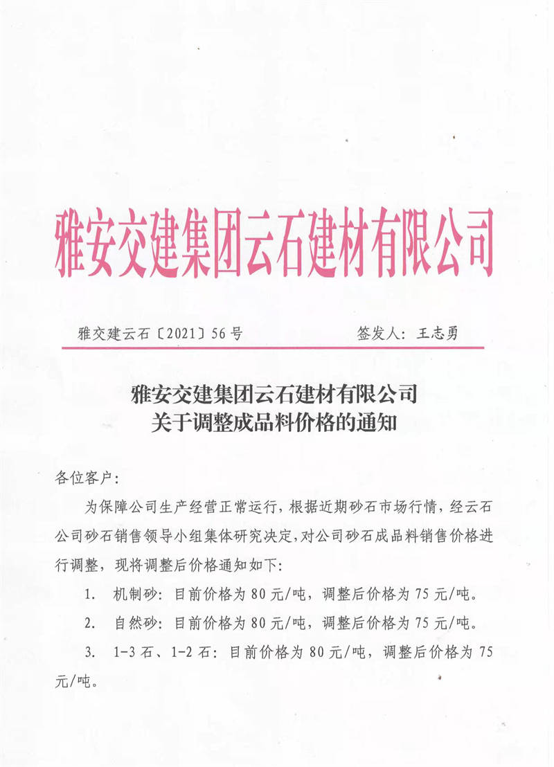 雅安交建集團云石公司關(guān)于調(diào)整成品料銷售價格的通知(2021.11.4)