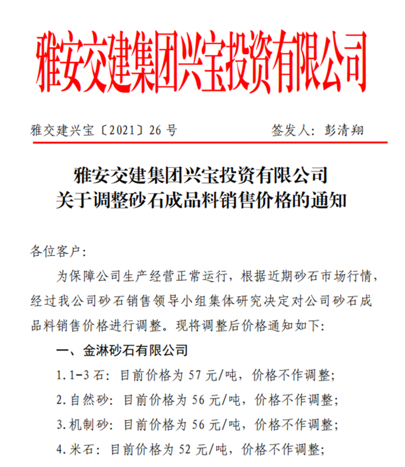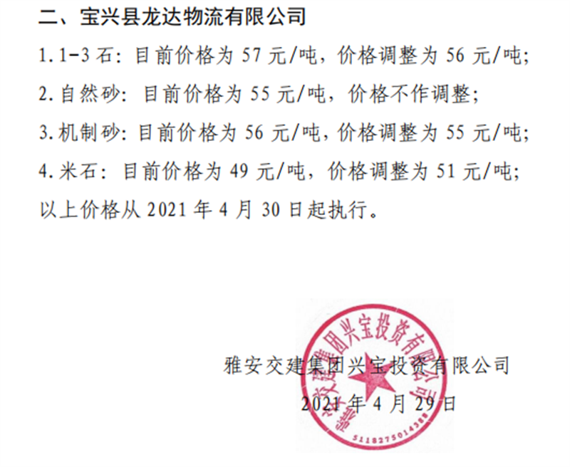 雅安交建集團(tuán)興寶公司砂石骨料銷售價格情況表(2021.4.30)