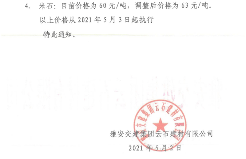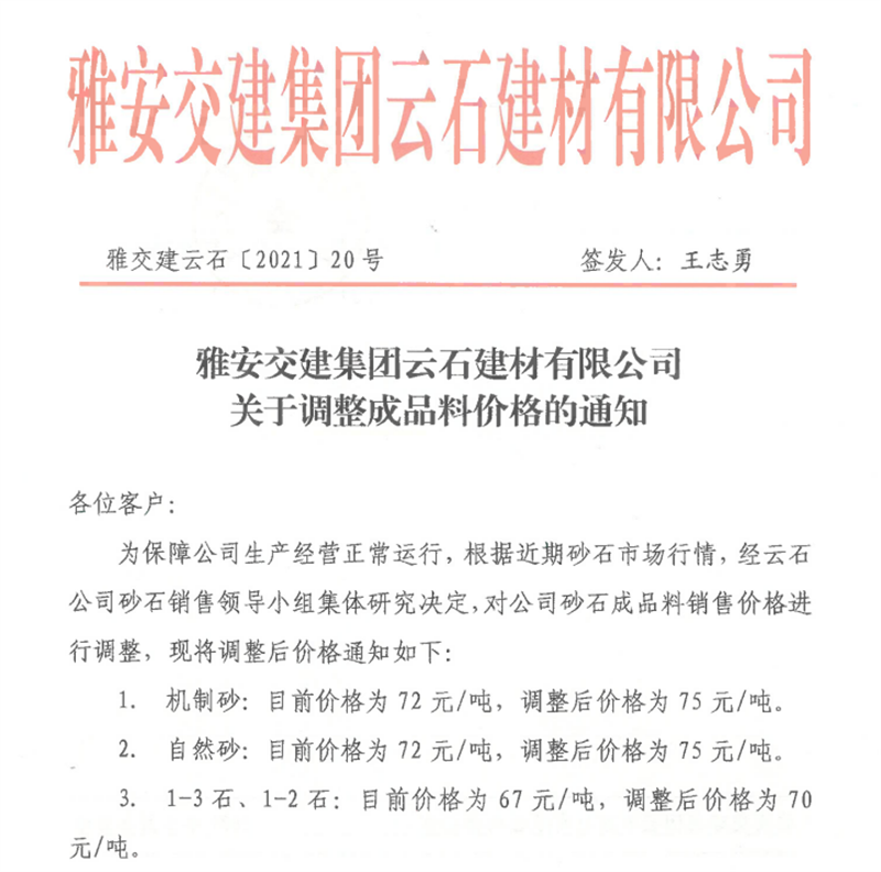 雅安交建集團(tuán)云石公司砂石骨料銷售價(jià)格情況表(2021.5.3)