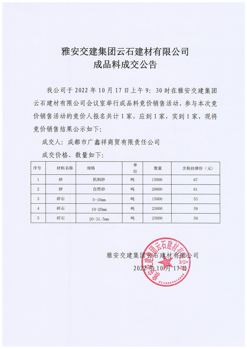 雅安交建集團(tuán)云石建材有限公司成品料成交公告10.17