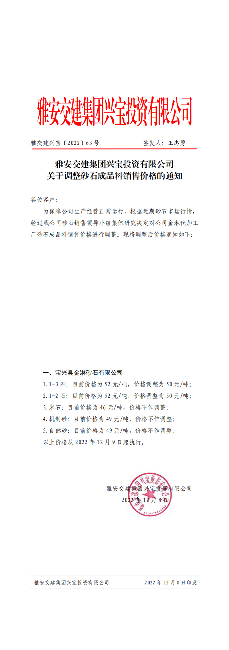 雅交建興寶〔2022〕63號 關(guān)于調(diào)整砂石成品料銷售價(jià)格的通知(2022-12-8)