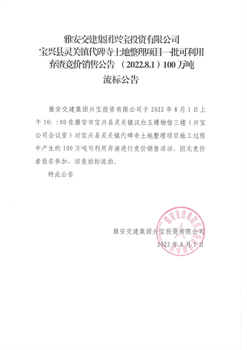 雅安交建集團興寶投資有限公司靈關(guān)鎮(zhèn)代碑寺土地整理項目100萬噸可利用棄渣競價銷售流標(biāo)公告(2022.8.1)