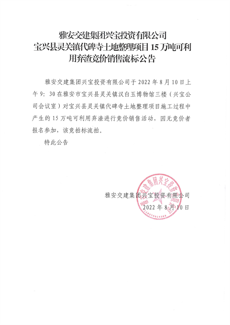 雅安交建集團(tuán)興寶投資有限公司靈關(guān)鎮(zhèn)代碑寺土地整理項目15萬噸可利用棄渣競價銷售流標(biāo)公告