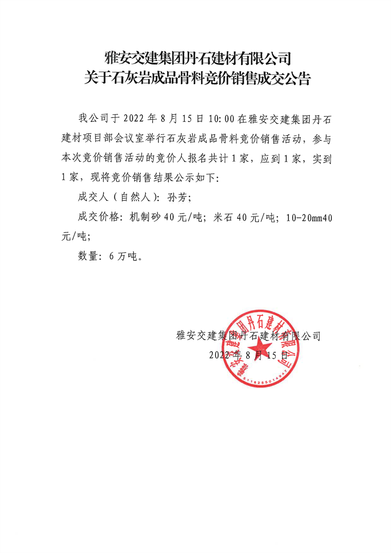 雅安交建集團(tuán)丹石建材有限公司關(guān)于石灰?guī)r成品骨料競價(jià)銷售成交公告