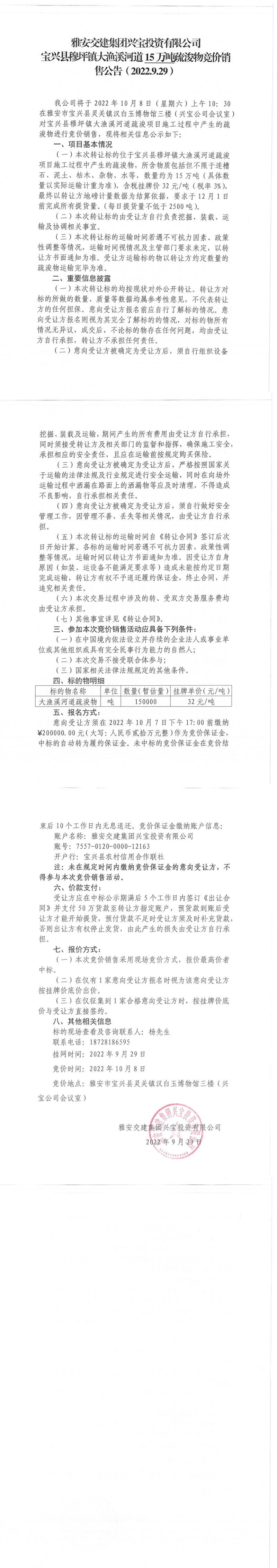 雅安交建集團(tuán)興寶投資有限公司寶興縣穆坪鎮(zhèn)大漁溪河道15萬噸疏浚物競價(jià)銷售公告(2022.9.29)