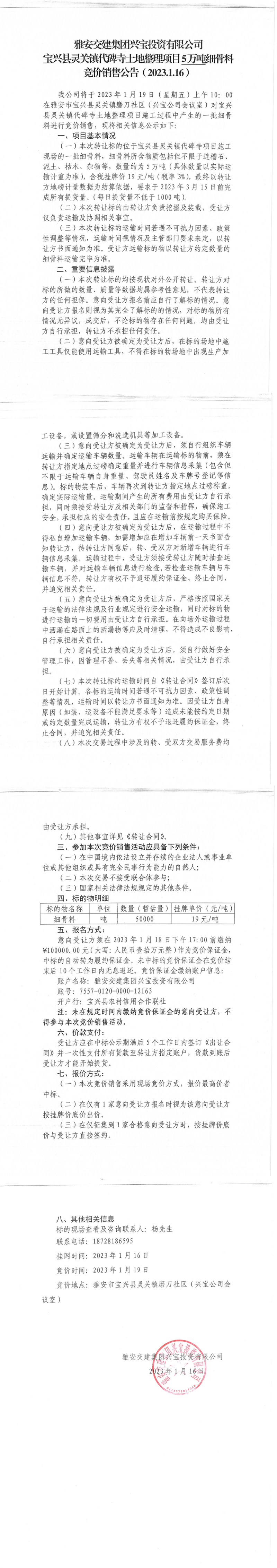 雅安交建集團興寶投資有限公司寶興縣靈關鎮(zhèn)代碑寺土地整理項目5萬噸細骨料競價銷售公告(2023.01.16)